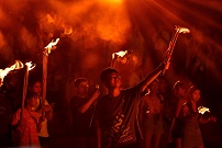 动手(扌)制作横幅,亢音高唱,庆祝抗战胜利。